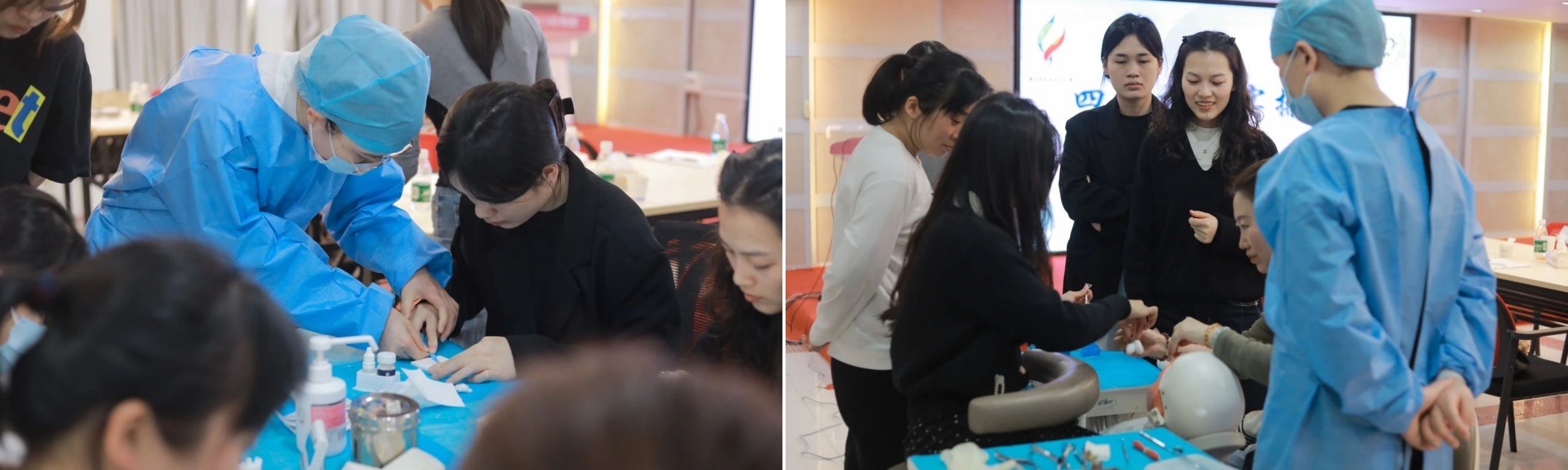 實訓現場,學員們(men) 全情投入,導師們(men) 穿梭指導。一位學員由衷感歎:“看似簡單的動作,原來藏著這麽(me) 多學問!隻有千錘百煉,才能讓肌肉記憶成為(wei) 專(zhuan) 業(ye) 底氣。”當最後一位學員成功調拌出完美印模時,夕陽的餘(yu) 暉已為(wei) 實訓室披上金色的榮光。