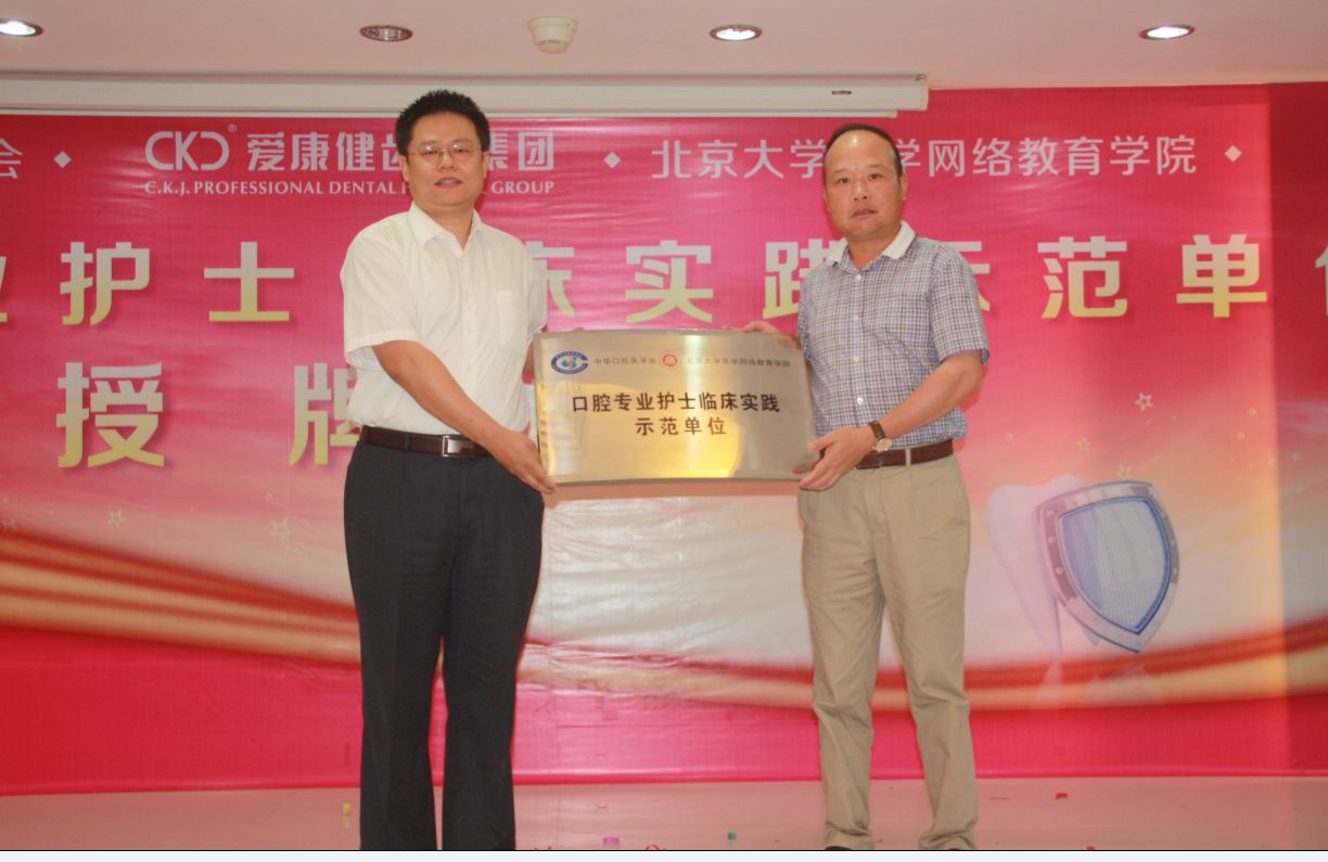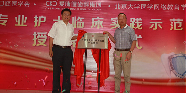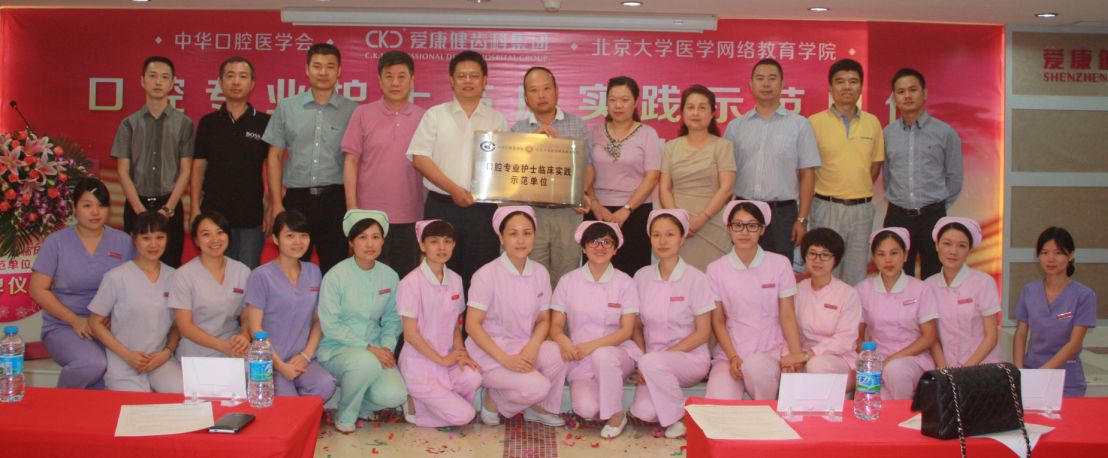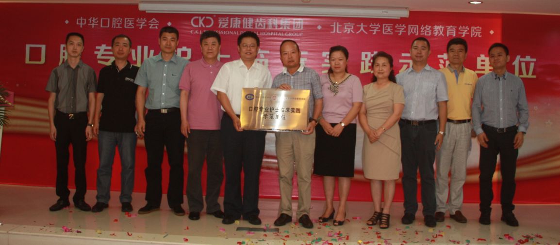14年6月25日,全國民營口腔機構“口腔專(zhuan) 業(ye) 護士臨(lin) 床實踐示範單位”授牌儀(yi) 式在愛康健齒科集團八樓報告廳隆重舉(ju) 行。中華口腔醫學會(hui) 副秘書(shu) 長韓亮、愛康健齒科董事長、總經理及醫生委員會(hui) 等各**部門領導及部分護士出席本次慶典儀(yi) 式,集團各**領導並作重要講話。
