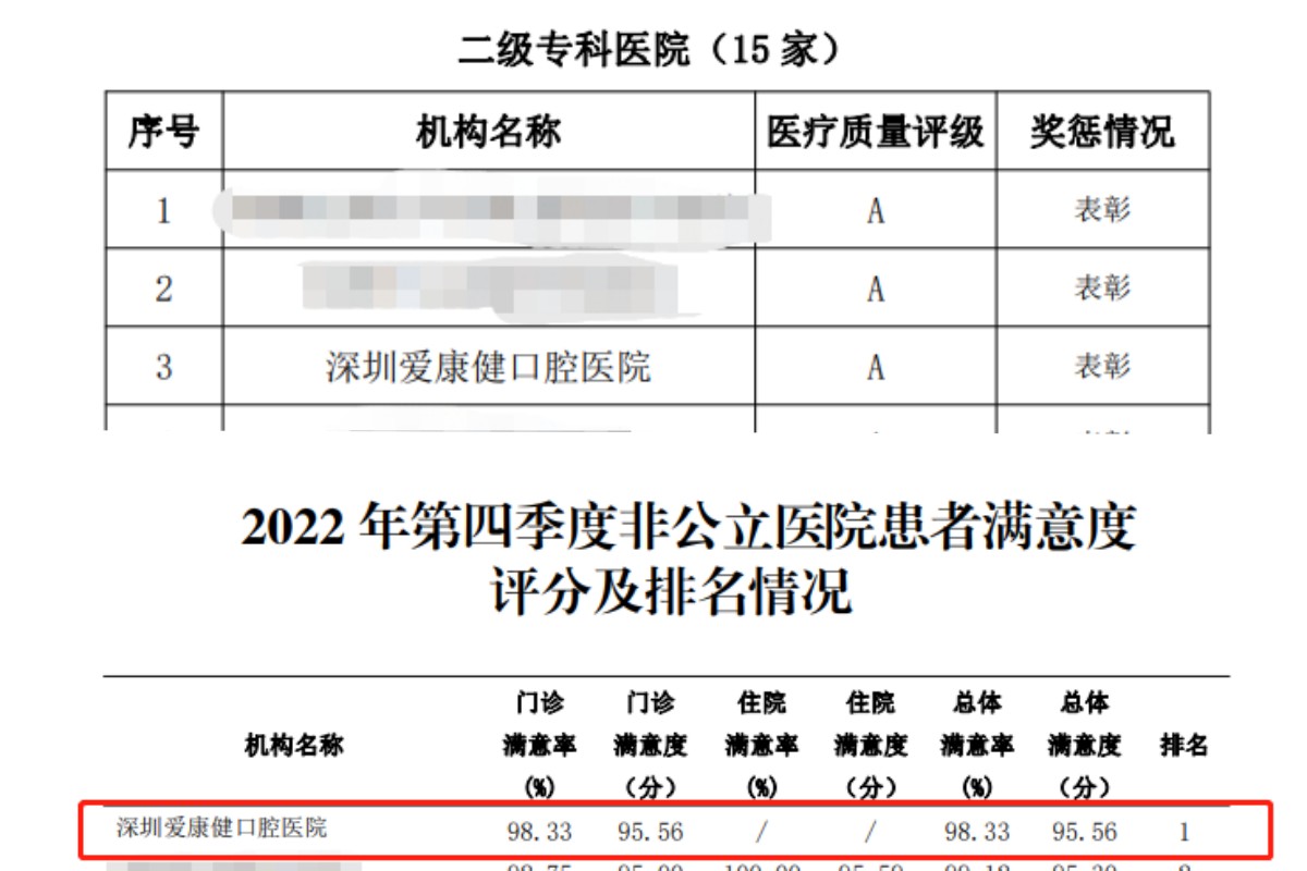 愛康健口腔始終堅持以“港式品質醫療”為(wei) 核心,深受社會(hui) 大眾(zhong) 的認可。深圳愛康健口腔醫院在3月先後在深圳市衛生健康委員會(hui) 評選中,收獲2021年度醫療服務質量A級單位、全市非公立醫院**滿意度排名第1的優(you) 異成績!並在深圳市衛健委發起的醫療行業(ye) 服務公眾(zhong) 滿意度調查監測中,獲登2022年第四季度深圳非公立醫院滿意度榜首。