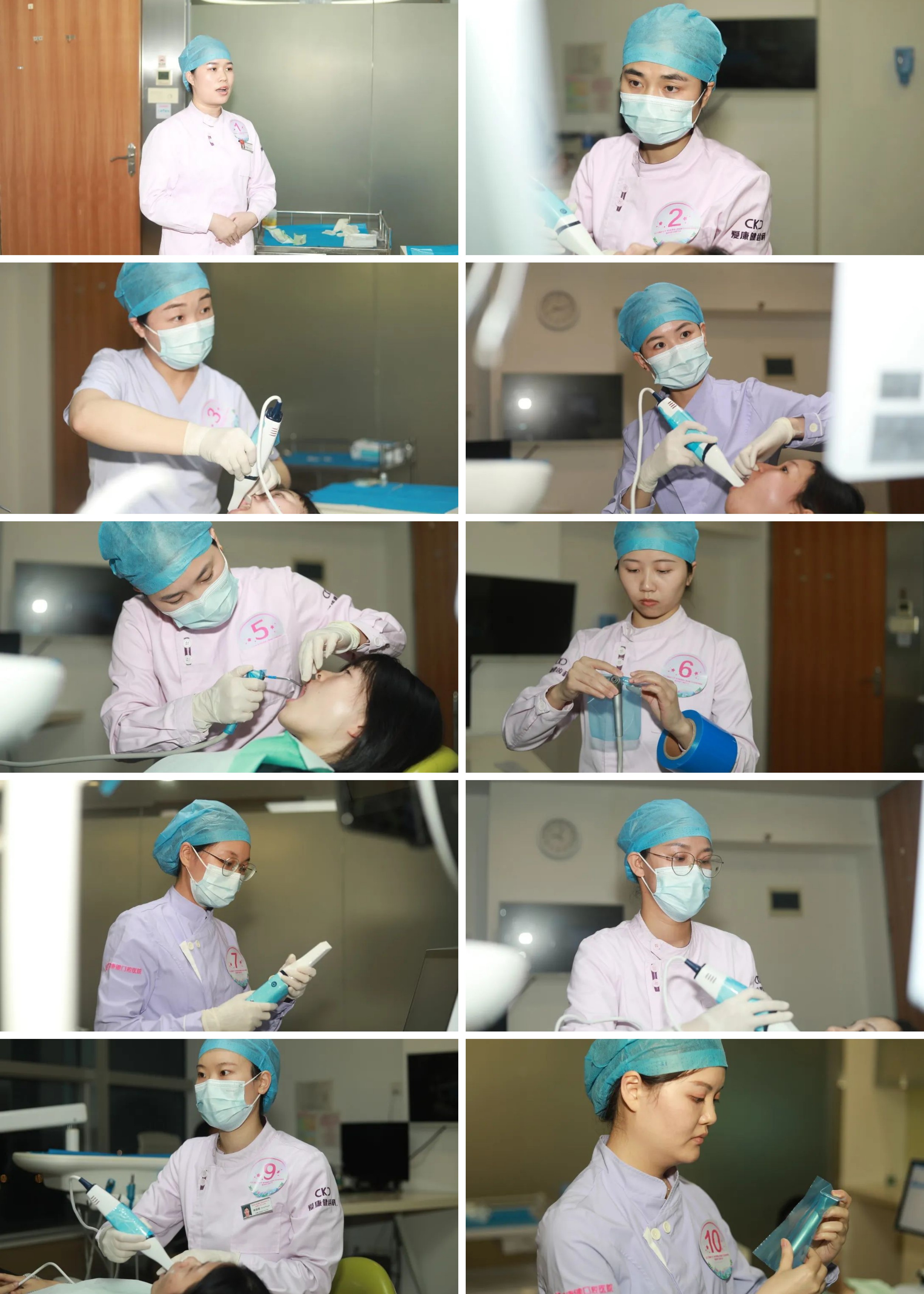本次口掃技能爭(zheng) 霸賽決(jue) 賽共有10組護理人員輪流上台比拚,展示他們(men) 的口掃技能。他們(men) 使用各種相同的口掃器械和技術,仔細地檢查每一位“客戶”的口腔情況。現場評委對每組護理人員的技能、速度、效果等方麵進行了綜合評估。