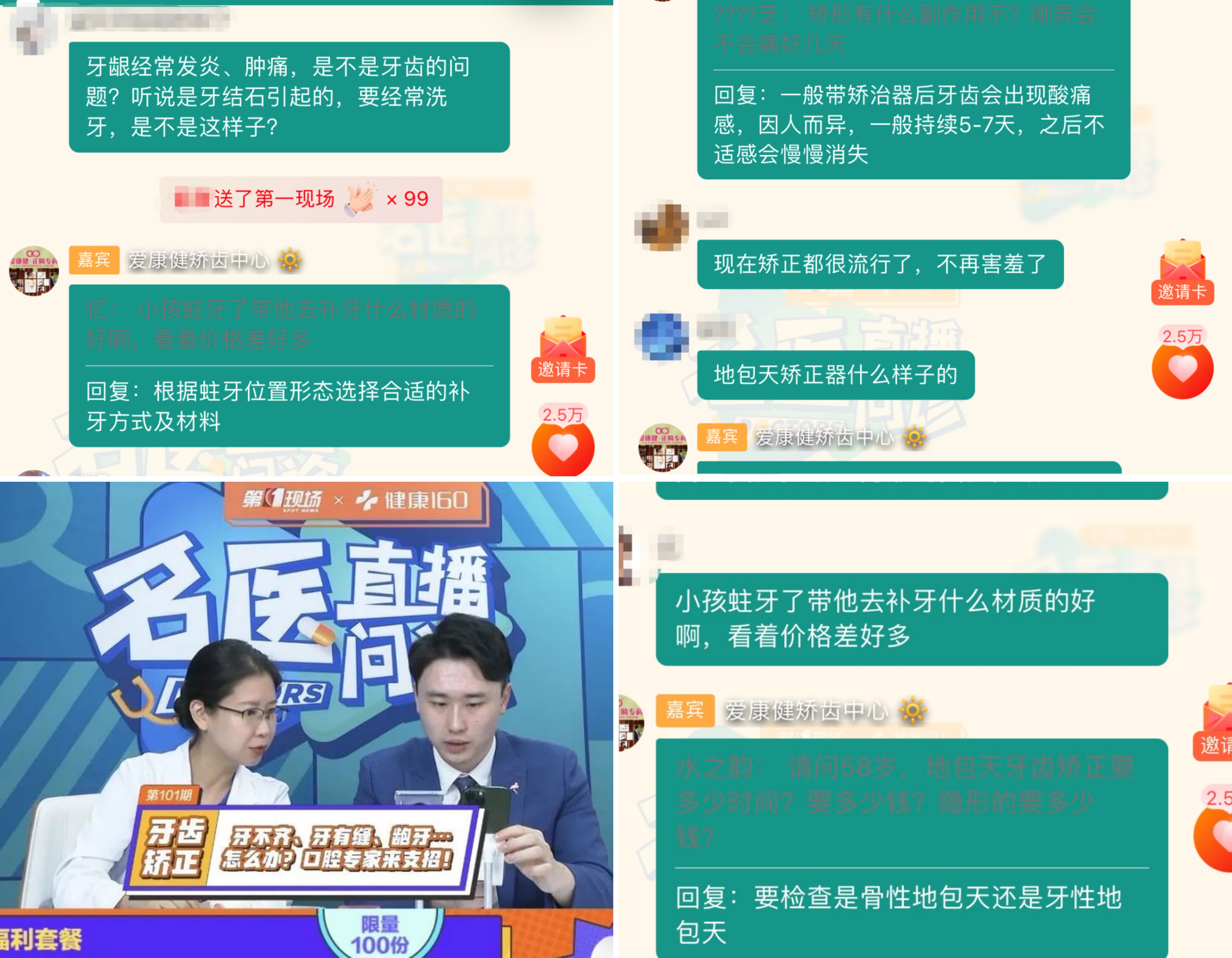 直播過程中除了臨(lin) 床經典病例講解及診療方案分享,更針對大眾(zhong) 關(guan) 心關(guan) 注的口腔健康疑問,進行科普解答。直播間更有醫師全程在線,持續實時解答觀眾(zhong) 提出的問題,互動氛圍濃厚,直播效果滿分!