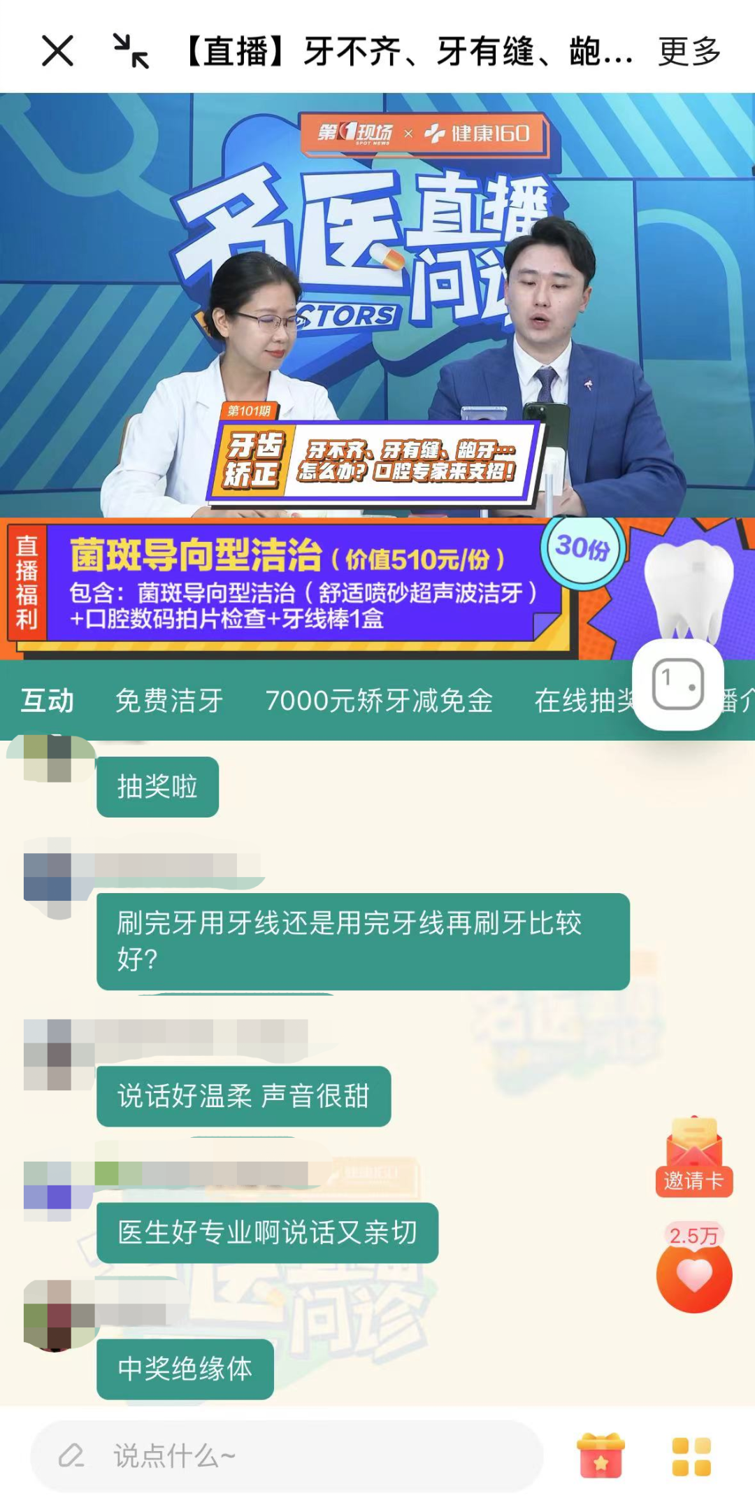 《名醫直播問診》直播間設置了幹貨分享/粉絲(si) 答疑/幸運抽獎/實時互動等多個(ge) 環節,市民朋友加入直播間討論還可以免費參與(yu) 多重福利抽獎。線上線下同時聯動,共同守護口腔健康!