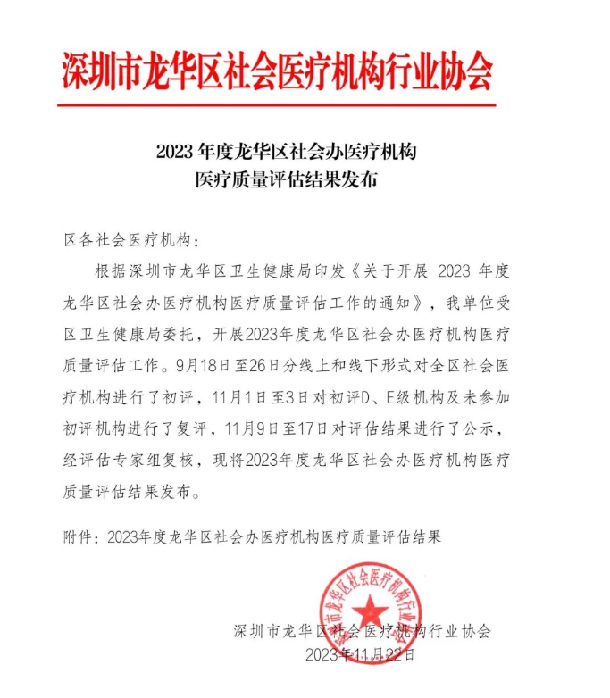 此次質量評估是由深圳市龍華區社會(hui) 醫療機構行業(ye) 協會(hui) 受區衛生局委托,根據深圳市龍華區衛生健康局印發《關(guan) 於(yu) 開展2023年度龍華區社會(hui) 辦醫療機構醫療質量評估工作的通知》開展2023年度龍華區社會(hui) 辦醫療機構醫療質量評估工作。9月18日至26日分線上和線下形式對全區社會(hui) 醫療機構進行了初評,11月1日至3日對初評D、E級機構及未參加初評機構進行了複評,11月9日至17日對評估結果進行了公示,經評估專(zhuan) 家組複核並發布。