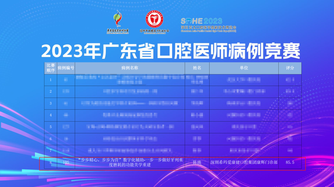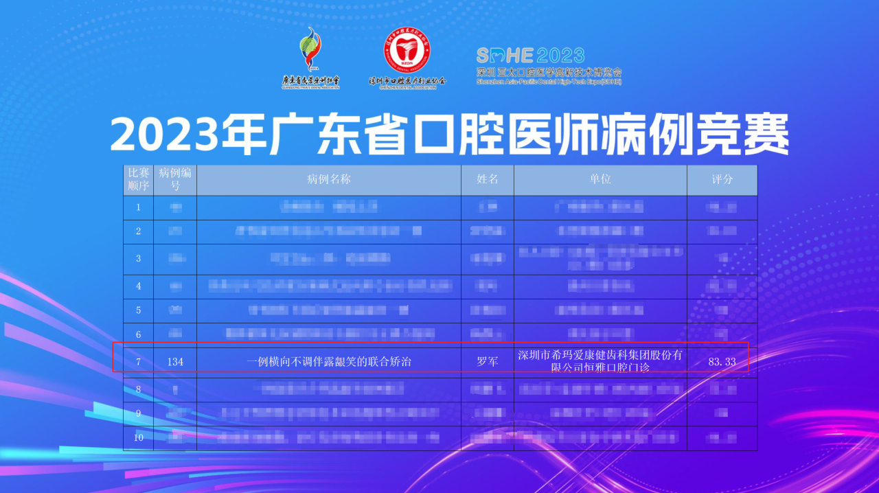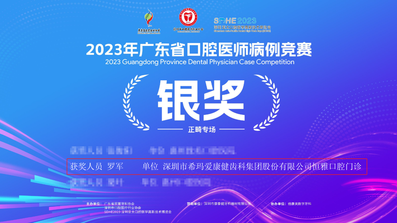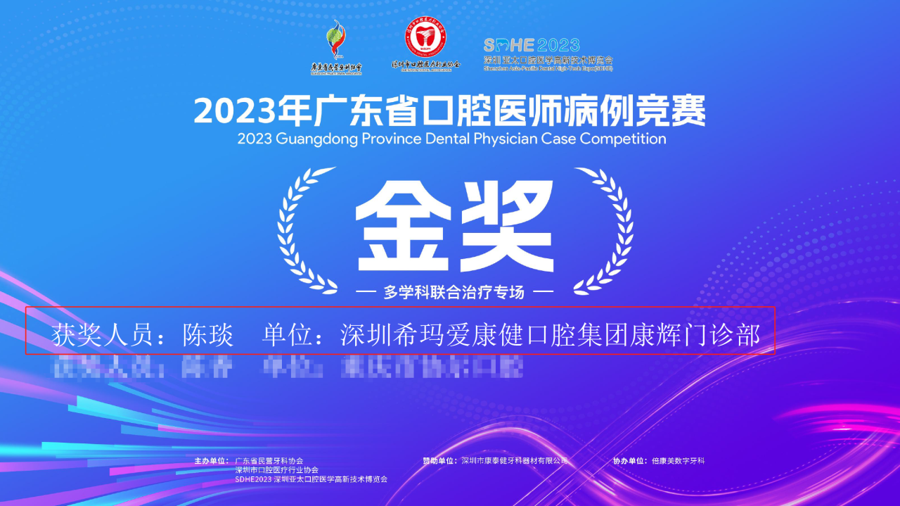 在2023年廣東(dong) 省口腔醫師病例競賽中,希瑪愛康健口腔集團旗下康輝門診部的陳琰醫生和恒雅口腔門診部的羅軍(jun) 醫生分別獲得了多學科聯合治療組“金獎”和正畸學科組“銀獎”。