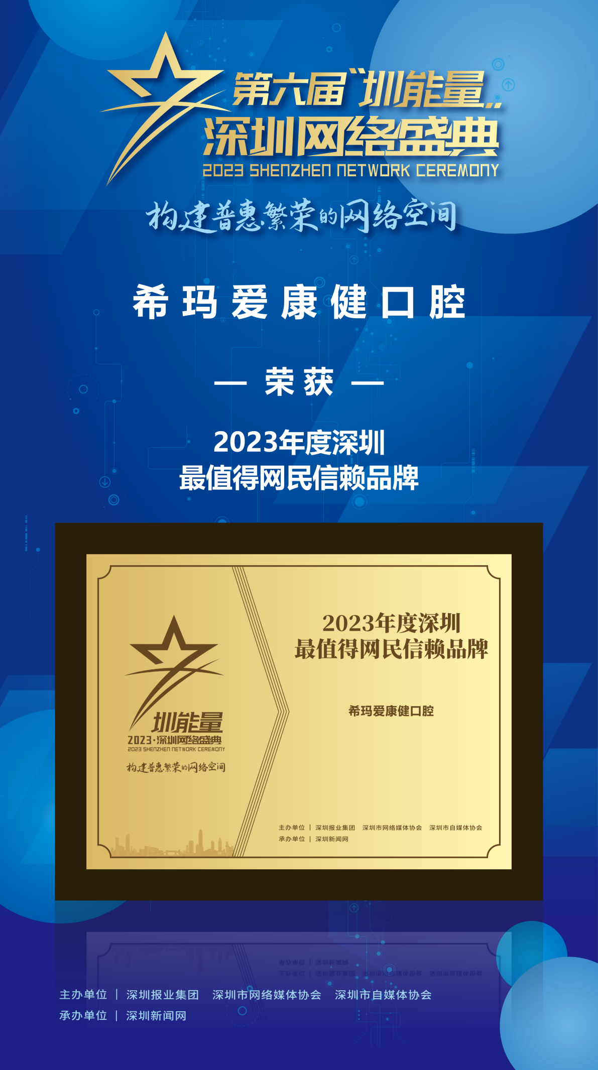 在近日由深圳市互聯網行業(ye) 聯合會(hui) 、深圳報業(ye) 集團等單位主辦的“構建普惠繁榮的網絡空間”第六屆“圳能量”深圳網絡盛典上,希瑪愛康健口腔榮獲了“2023 年度深圳最值得網民信賴品牌”稱號,成為(wei) 了深圳網絡盛典的一大亮點。