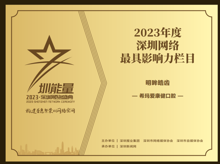 在深圳這個(ge) 繁華的城市,互聯網行業(ye) 蓬勃發展,各種創新和優(you) 秀作品層出不窮。近日,一年一度的深圳網絡盛典如期而至,這是一場盛大的活動,旨在表彰那些在互聯網行業(ye) 取得傑出成就的單位和個(ge) 人。在這個(ge) 舞台上,希瑪愛康健口腔憑借其“明眸皓齒”項目榮獲了“2023 年度深圳網絡最具影響力欄目”的榮譽稱號。