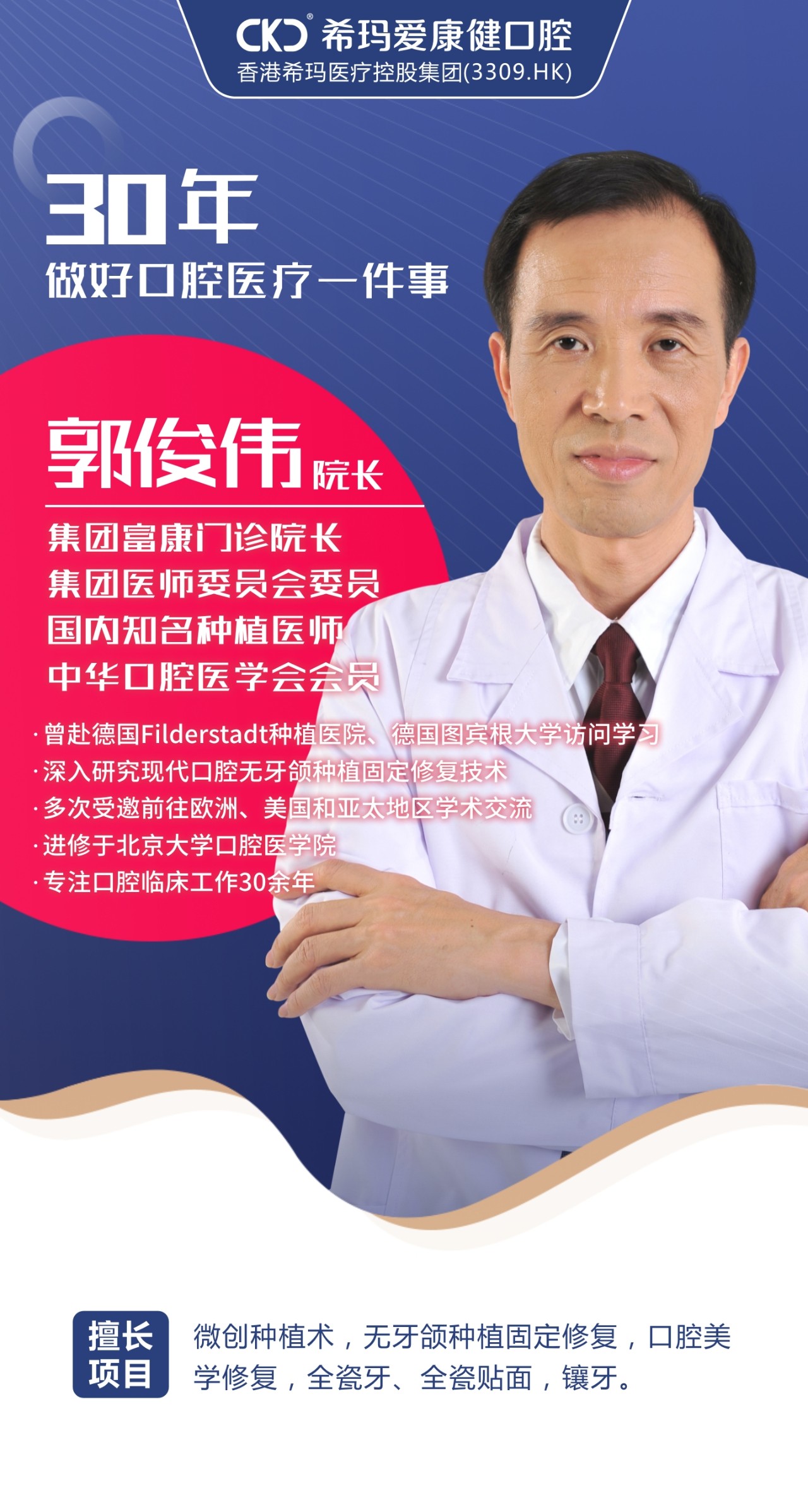 郭俊偉(wei) 院長是一位資深口腔醫生,他不僅(jin) 技術精湛,更注重醫德醫心,將客戶當作朋友對待。在行醫路上,郭俊偉(wei) 院長潛心鑽研30餘(yu) 載,穩步前行,致力於(yu) 幫助更多有口腔健康困擾的客戶。...