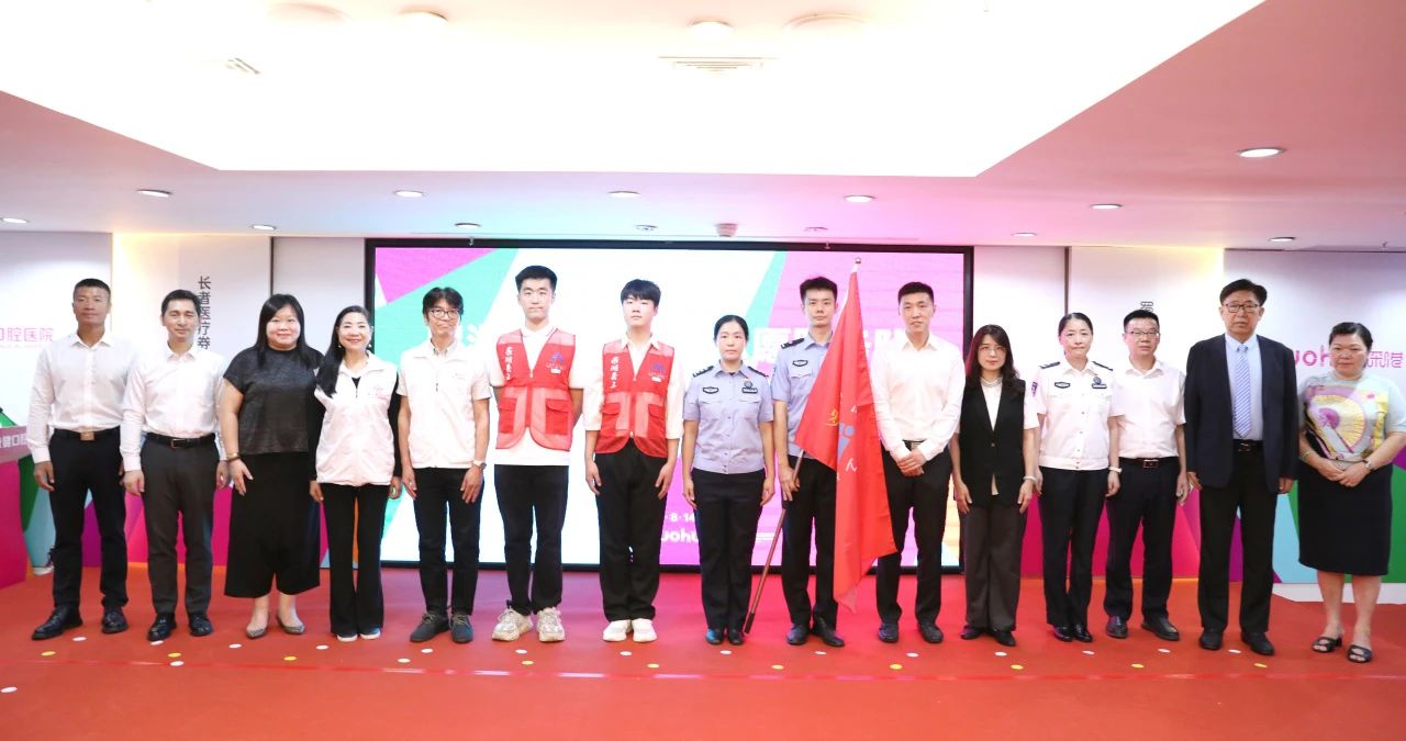 (“羅湖口岸多語言誌願服務隊”授旗合影,右2:希瑪愛康健口腔集團總經理李春山、右1:希瑪愛康健口腔集團董事邱淑賢)