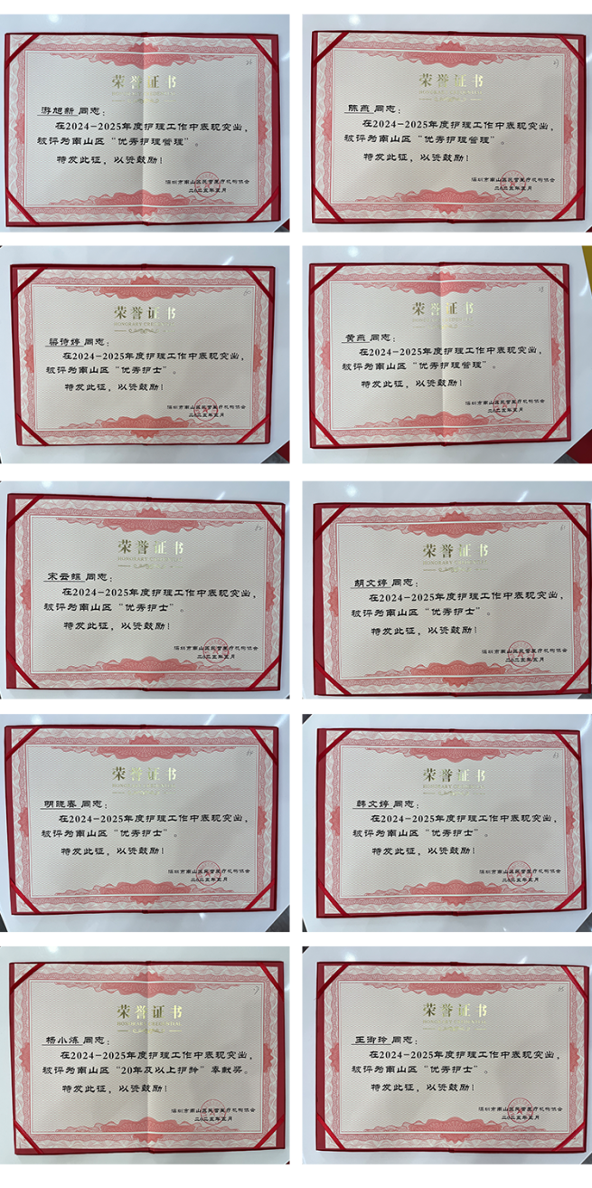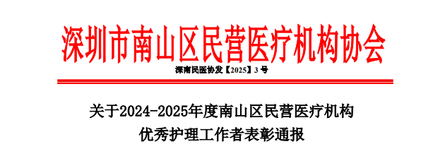 在“5·12”國際護士節這個(ge) 意義(yi) 非凡的日子裏,我們(men) 積極倡導、傳(chuan) 承並大力弘揚南丁格爾精神。旨在激發民營醫療護理領域從(cong) 業(ye) 者愛崗敬業(ye) 、奮勇拚搏、積極進取以及無私奉獻的工作熱忱。為(wei) 此,深圳市南山區民營醫療機構協會(hui) 對2024-2025年度“優(you) 秀護士”、“優(you) 秀護理管理者”等進行了表彰通報。