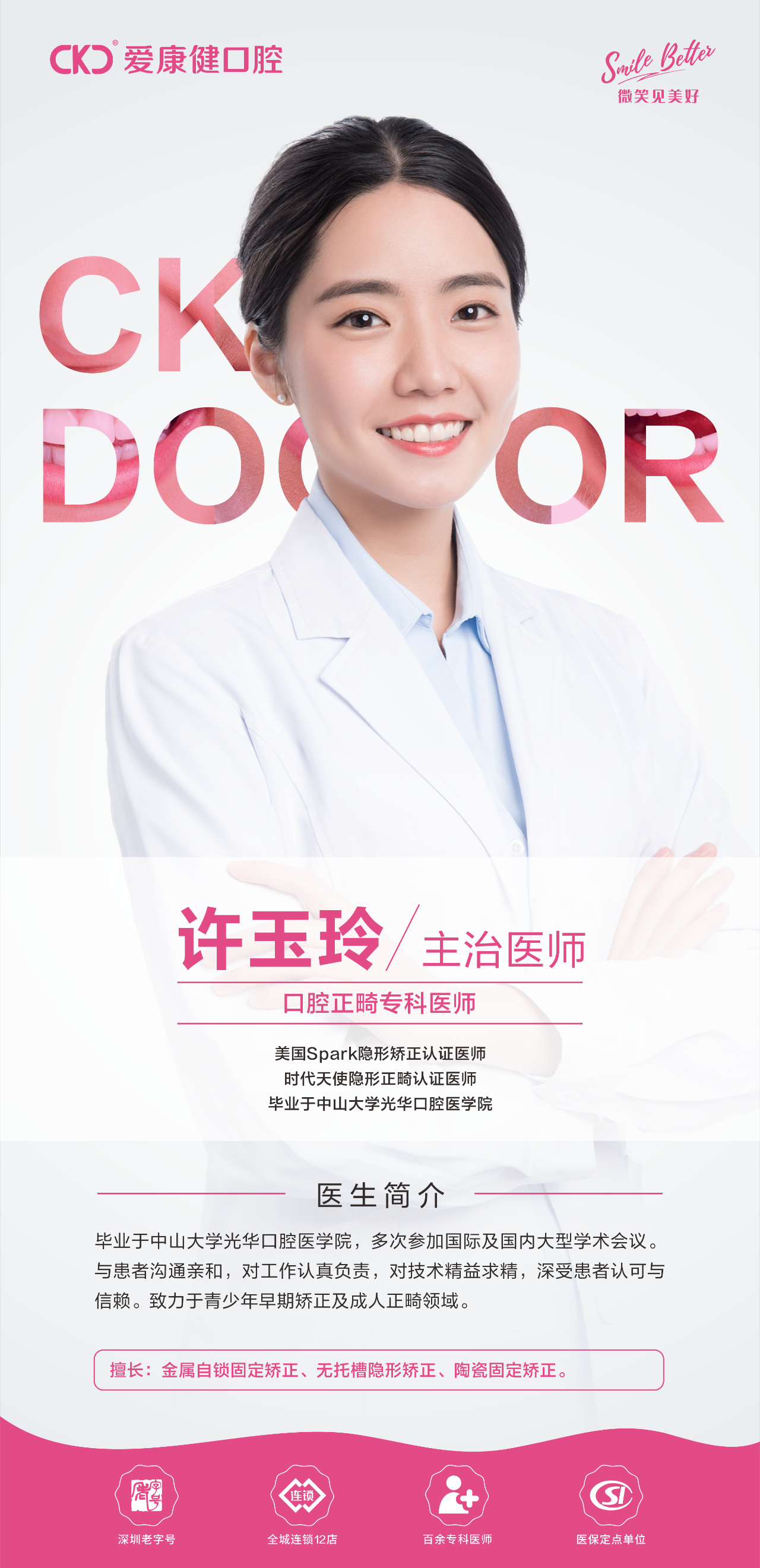 許玉玲醫生作為(wei) 希瑪愛康健口腔的傑出代表,不僅(jin) 擁有中山大學光華口腔醫學院的深厚學術背景,更在公立醫院積累了豐(feng) 富的臨(lin) 床工作經驗。她始終秉持“健康、功能、美學”三位一體(ti) 的治療理念,以高度的責任心和精湛的醫術贏得了患者的廣泛信賴與(yu) 好評。