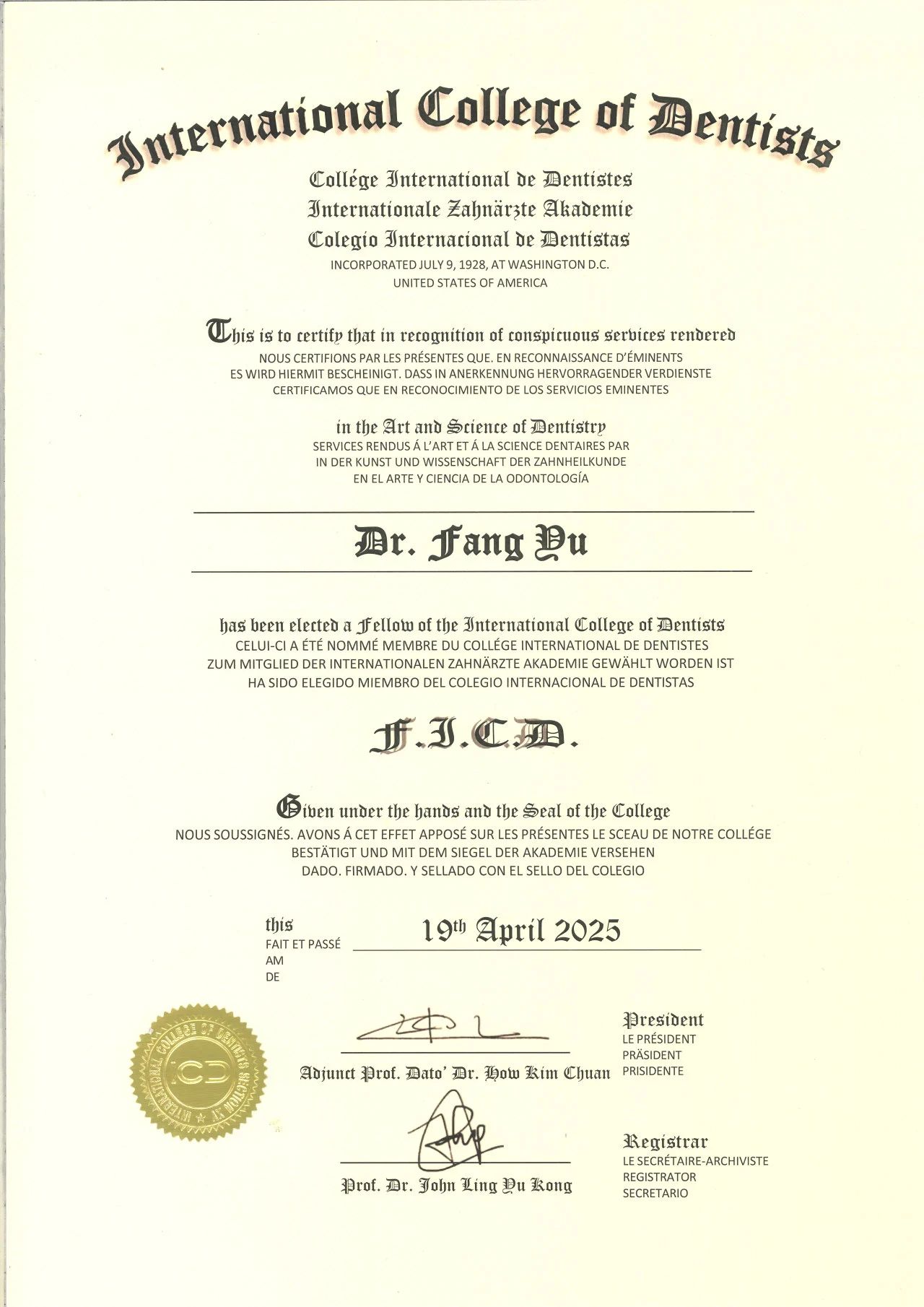 國際牙醫師學院(International College of Dentists,ICD)創立於(yu) 1920年,總部位於(yu) 美國,是目前全球曆史悠久、學術地位最高的牙科醫生國際組織之一。學院在122個(ge) 國家和地區設有分區,致力於(yu) 遴選和表彰在學術研究、臨(lin) 床服務、醫療倫(lun) 理和公益慈善等方麵具卓越貢獻的牙醫,目前全世界有12,000餘(yu) 名院士。