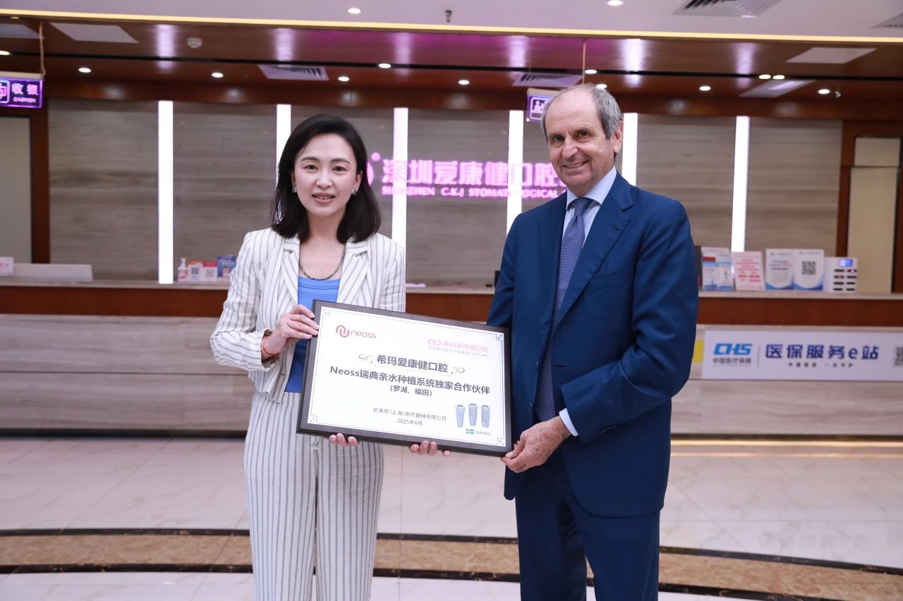 活動最後,希瑪愛康健口腔集團與(yu) 全球知名種植體(ti) 品牌Neoss共同舉(ju) 行了"瑞典親(qin) 水種植係統獨家合作夥(huo) 伴"授牌儀(yi) 式。李肖婷總裁與(yu) Luongo教授共同為(wei) 這一重要合作揭幕,標誌著希瑪愛康健正式成為(wei) Neoss親(qin) 水種植係統在中國市場的獨家合作夥(huo) 伴。