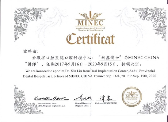 劉鑫,口腔醫學博士,安徽醫科大學副教授,作為(wei) 碩士博士均為(wei) 口腔種植專(zhuan) 業(ye) 的專(zhuan) 科醫生。專(zhuan) 業(ye) 從(cong) 事口腔種植工作15年,獨立完成種植修複病例近萬(wan) 例,專(zhuan) 業(ye) 特長涵蓋穿顴穿翼、全口無牙頜、上頜竇提升、複雜的軟硬組織移植、即刻種植即刻修複、前牙美學、數字化和種植導航等諸多領域。逐漸形成了安全、微創、美學的簡單化操作風格。多次赴國外知名牙科院校進行學術交流(曼穀、美國、俄羅斯、德國、以色列),多次參加或者指導研究生參加國內(nei) 外種植專(zhuan) 業(ye) 大獎賽並獲得良好成績。目前被聘為(wei) 多個(ge) 國際知名種植體(ti) 品牌(Nobel,蓋世公司,)的講師或者高級講師。